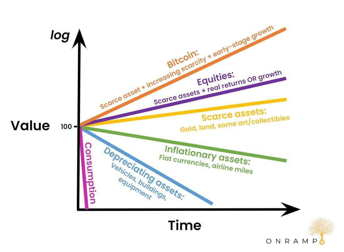 The two types of modern currencies we’ve now looked at have very different DNA. The first, fiat currency, is designed to exponentially decay in purchasing power over time. The second, Bitcoin, is designed to exponentially appreciate in purchasing power over time.