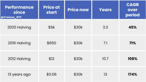 While past performance is not indicative of future results, past performance is instructive for forecasting future performance… when the mechanics that drove past performance will happen again (i.e., Bitcoin’s halvings).