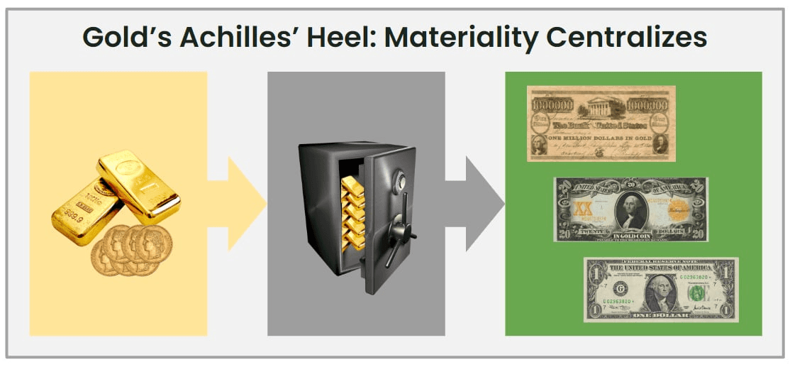 But gold had an Achilles’ Heel — its materiality necessitated storage in vaults, which ultimately allowed centralized authorities (governments) the ability to control it & slowly shift the meaning of money over time.