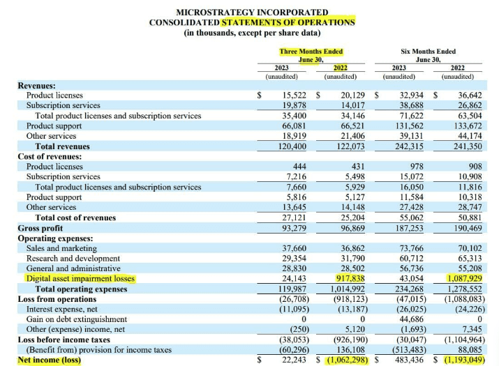Because of the way these impairment charges are calculated and flow to the earnings statement, MicroStrategy regularly reports quarterly and annual operating losses. In fact, here’s a Bloomberg headline from earlier this year: “MicroStrategy Posts Another Loss After Bitcoin Charge – Software firm has registered eight straight quarterly losses.”
