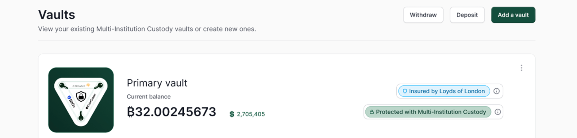 Building for the long-term security of the most important asset of the 21st century requires patience, a commitment to our clients, and innovative thinking to solve existing and emerging problems. At Onramp, we aren't a "wrapper" for legacy custodians or their infrastructure. We don't rely on third-party infrastructure to manage our vaults; we have architected and built our own underlying infrastructure from the ground up to create, manage, and secure Multi-Institution Custody (MIC) vaults.