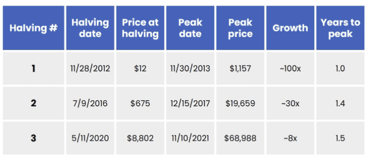 Here’s the performance from halving date to price peak, following each of the three Bitcoin halvings to-date: