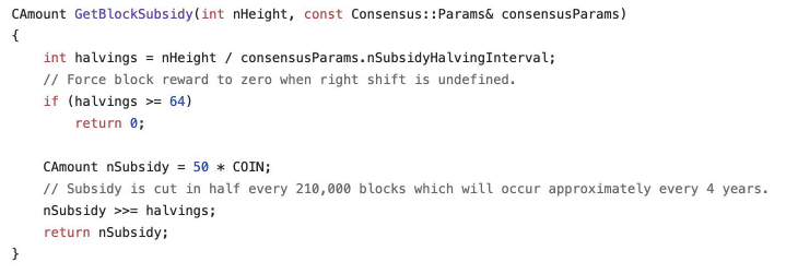 Here’s what it says. First, the code counts how many halvings have occurred. A halving is pre-set to occur every 210,000 blocks (~4 years, since there is a new block every 10 minutes on average).