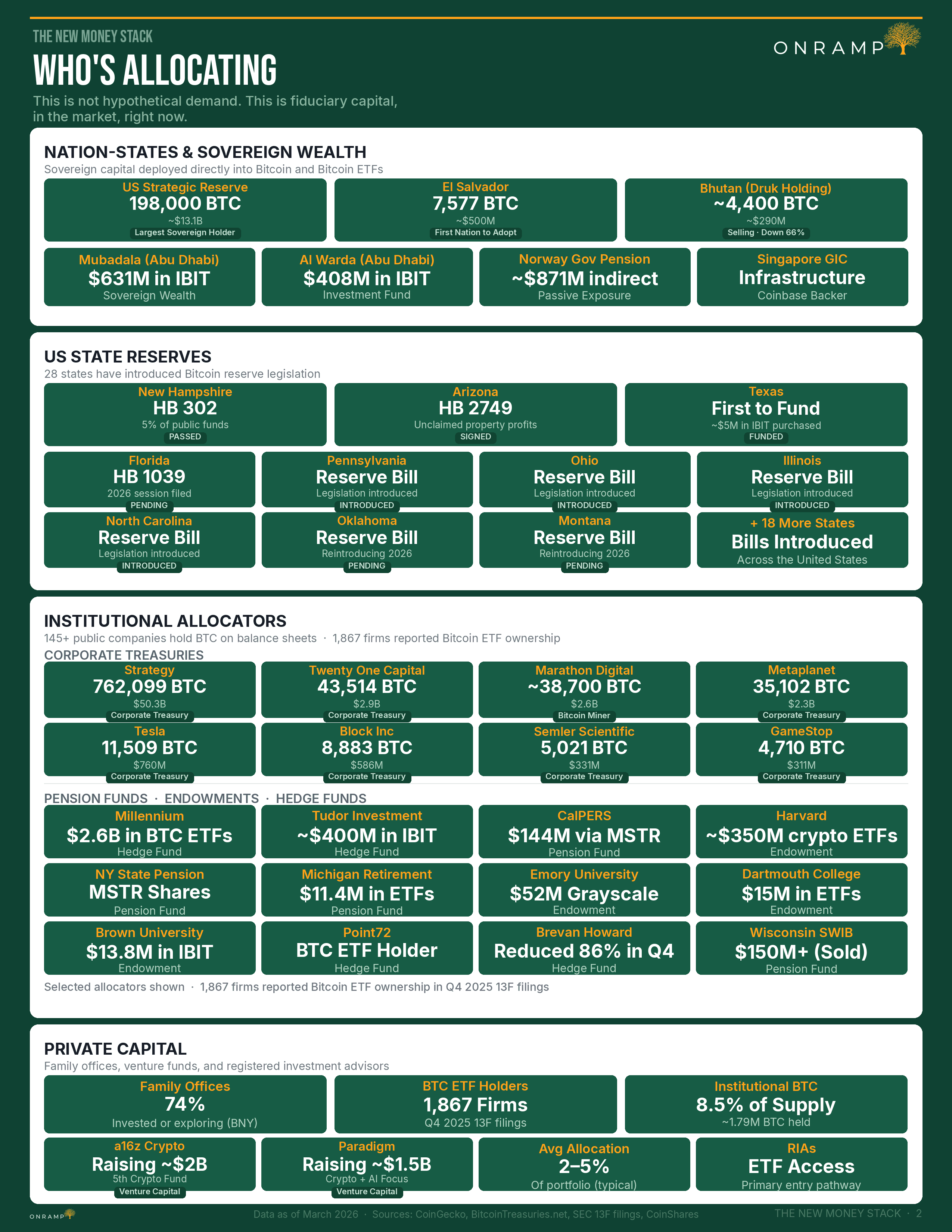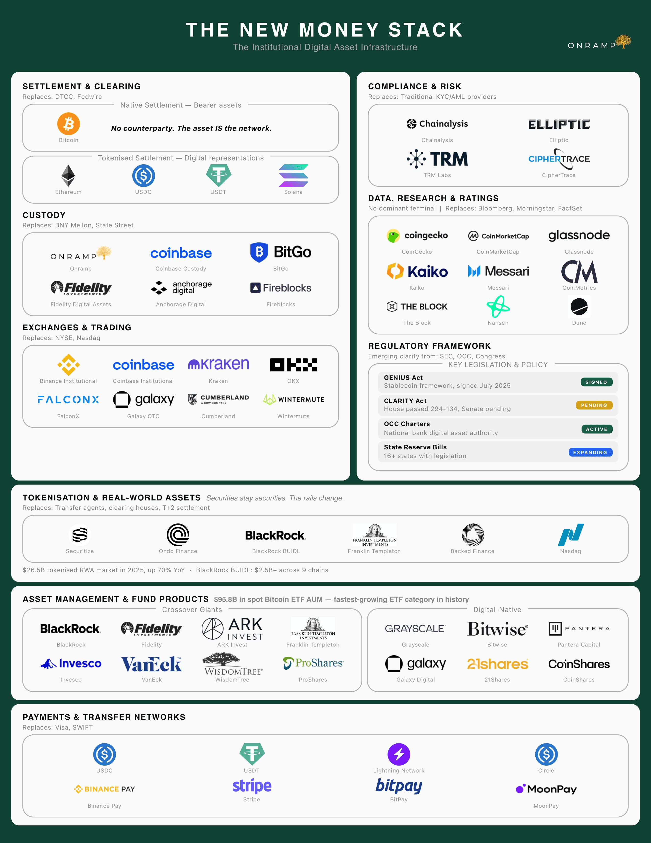 This report is the first in a series from Onramp Research. Upcoming publications include the Custody Architecture Map (MIC vs MPC vs HSM), AI Commerce Payment Rails, the Stablecoin Stack (GENIUS Act Edition), the Bitcoin ETF and Asset Manager Universe (Q1 2026 13F analysis), the Allocator Map, and the State and Sovereign Bitcoin Reserve Tracker.