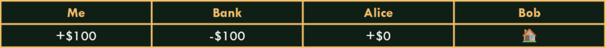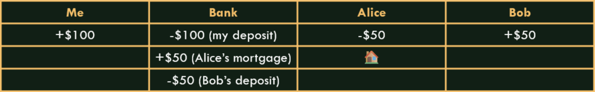 What if in the meantime, however, your bank decides to lend a portion of your money out to Alice, to buy a house from Bob, and Bob deposits the proceeds from the sale of his house into his checking account at the bank?