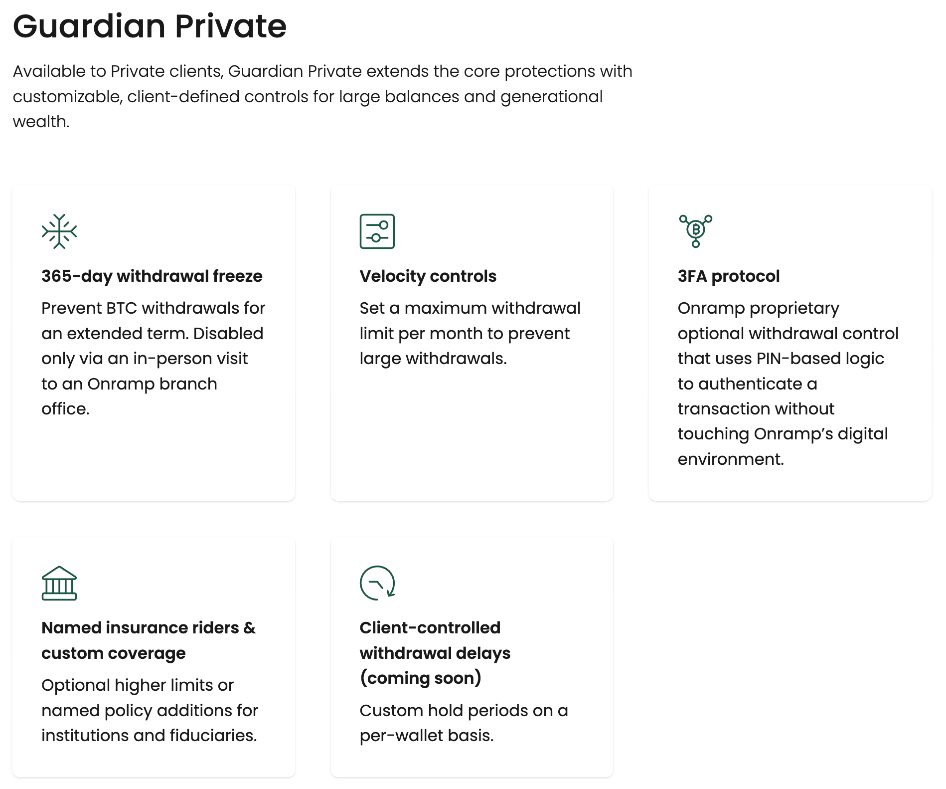 Guardian formalizes what has always been true about Onramp: we lead on security. Our multi-institution custody already eliminates single points of failure. Guardian takes that structural advantage and extends it to the client experience.